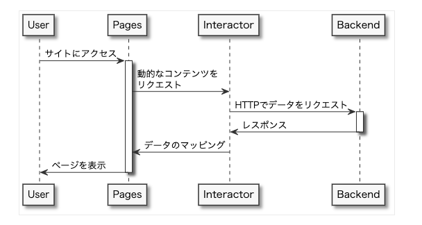 また、interactorsというディレクトリはあまり見かけないと思います。この役割はfetcherとmapperです。つまり、APIのレスポンスデータであるJSONをJavaScriptのオブジェクトに変換し、TypeScriptでドメインの型にマッピングするための処理を記述しています。このレイヤーにより、APIの変更による影響を最小限に抑えることができます。こちらは次の章で説明します。