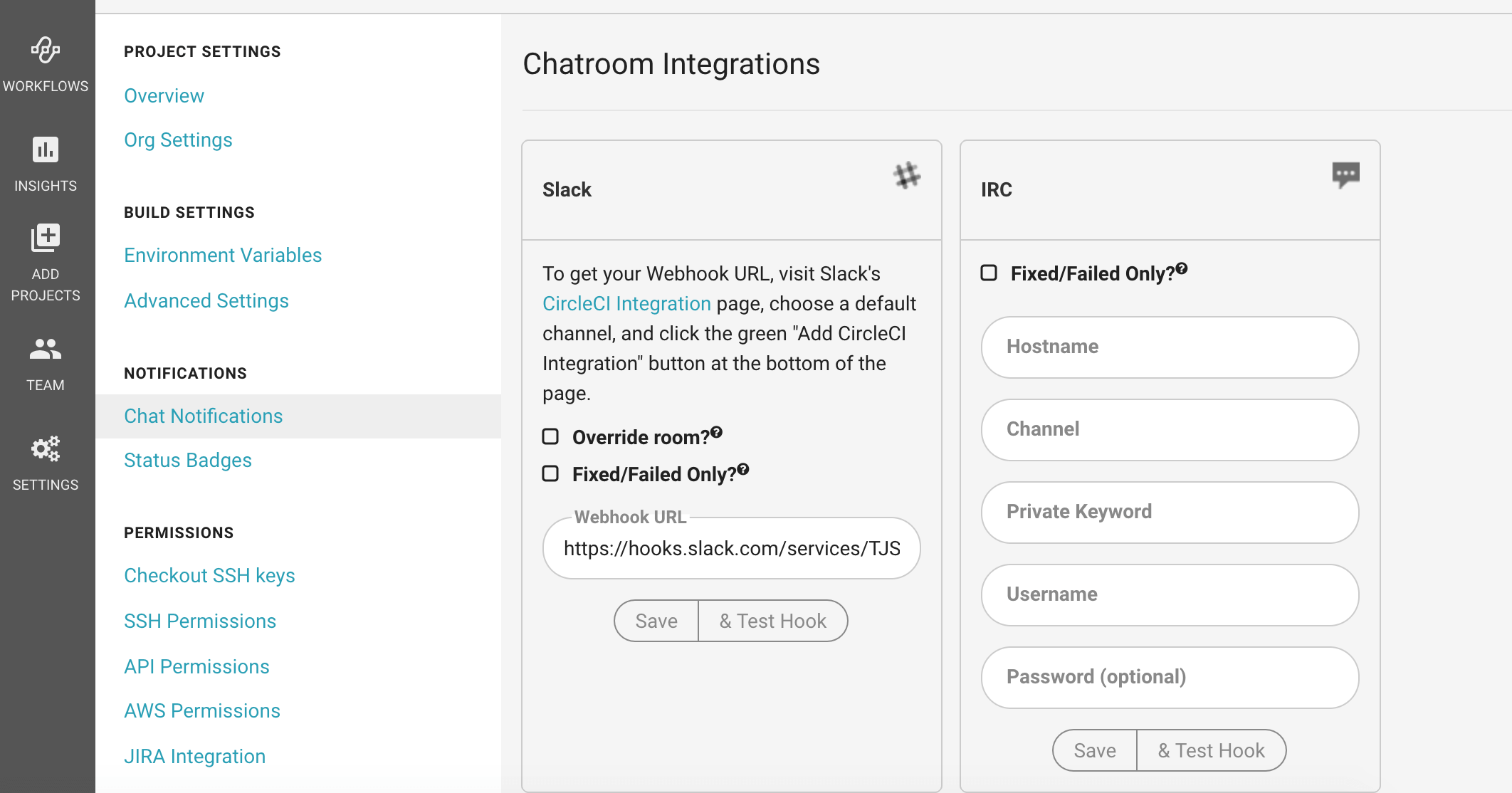 そのURLをCircle CIのプロジェクトのSETTINGS > NOTIFICATIONS > Chat NotificationのWebhook URLの欄に記入します。