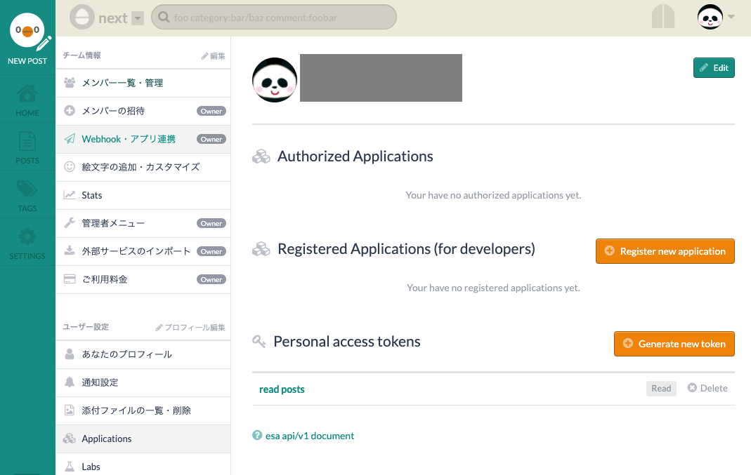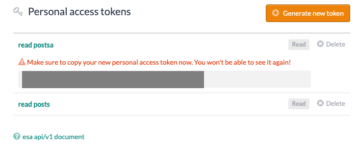 まずはHTTPリクエストでesaの記事を取得するために、APIキーを作成しましょう。