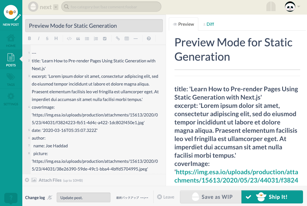 そのため、メタ情報をesaの記事に記述する必要があります。また、Next.jsの9.4から実装されたPreviewモードは、esaにAPIがないため利用できません(ただ、previewAPIがなくともesaのエディタのpreviewで十分だとは思っています)。