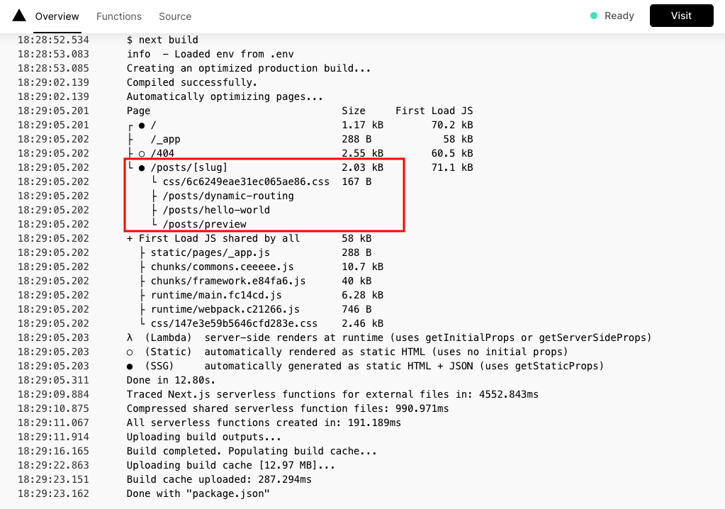●は、SSGで作成されたページであることを表します。ファイルは/pages/[slug].jsしか用意していないのに、getStaticPathsで取得したslugに応じてdynamic-routing、hello-world、previewの3つのページが作成されています。これがSSGの特徴です。
