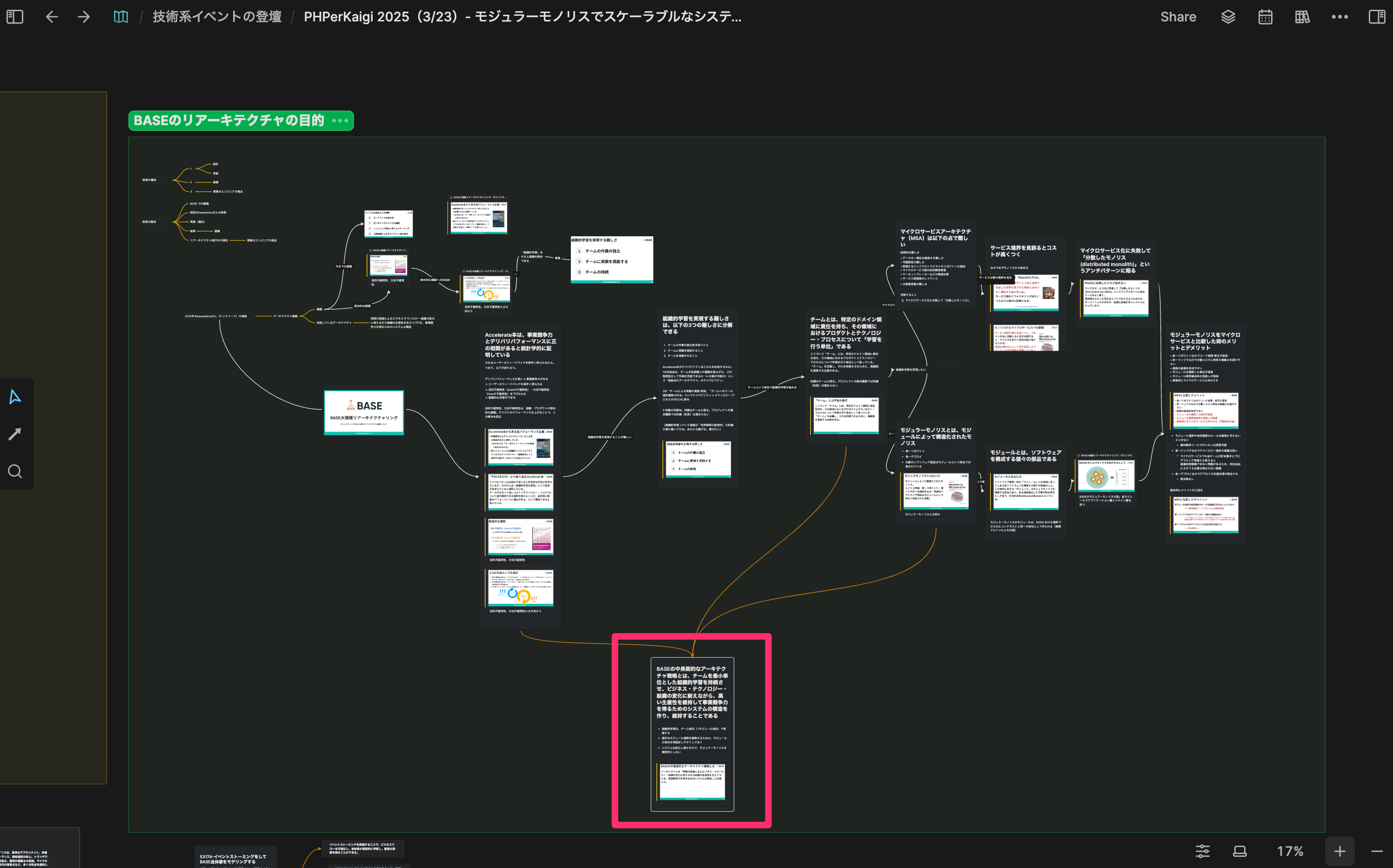 出発日の午後、実家から新幹線に乗ってきた弟に会ったときに、自分が引きつった顔で「行きの飛行機の中で仕事するわ...」と言ったのを覚えています。ただ、その飛行機の中で、アーキテクトの作った2年前のスライド「BASE大規模リアーキテクチャリング」を、自分の新しい相棒の Heptabase 上でひたすら読み解いていたら、なるほどこういうことだったのかと理解し、光明が見えました。