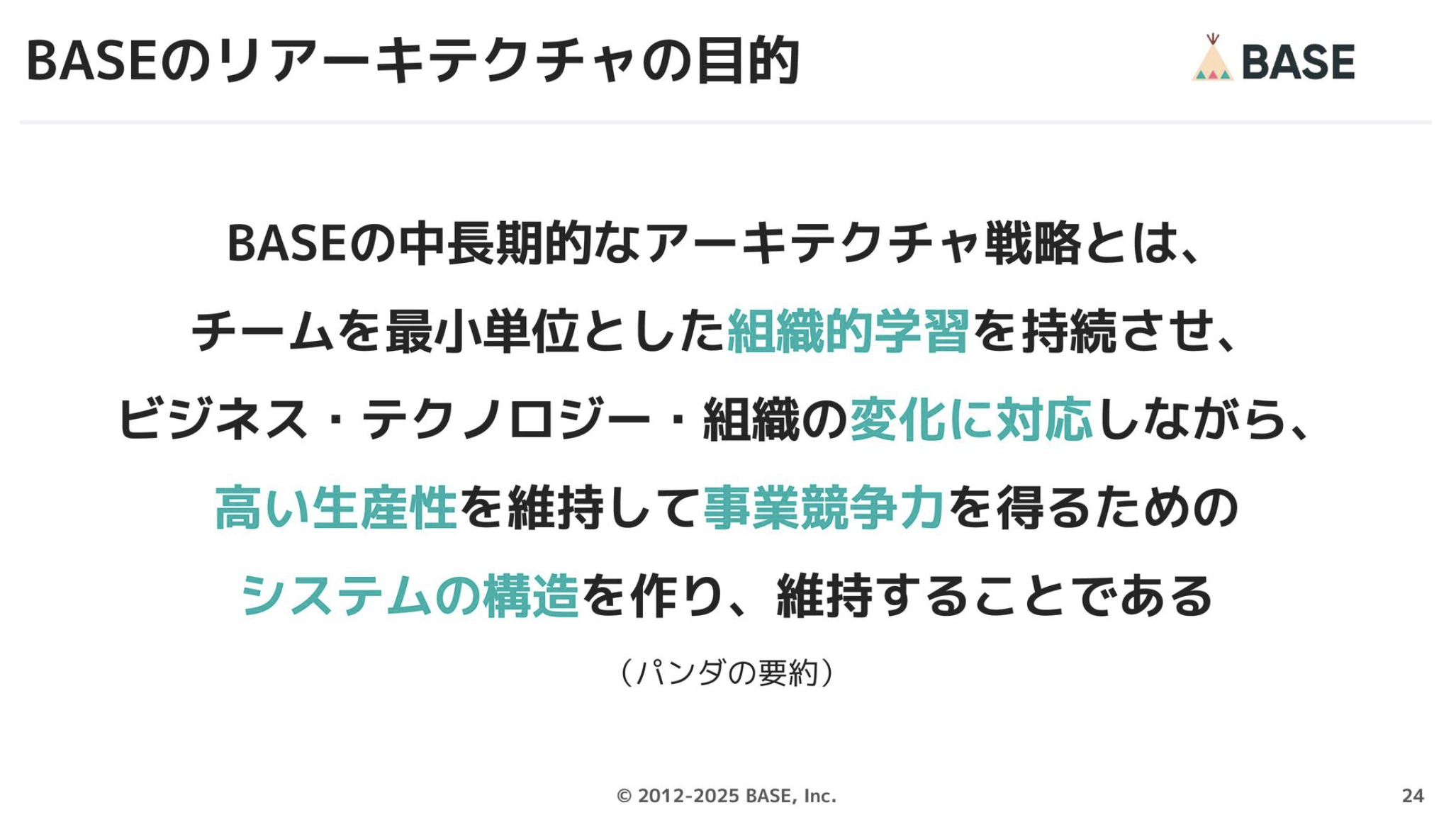 その後、モジュラーモノリスの基盤部分の技術的な話、各モジュール内の特徴や開発チームの話、最後に4年前から続くBASEのリアーキテクチャの狙いは今どういう評価なのか、開発組織の観点からお話ししました。
