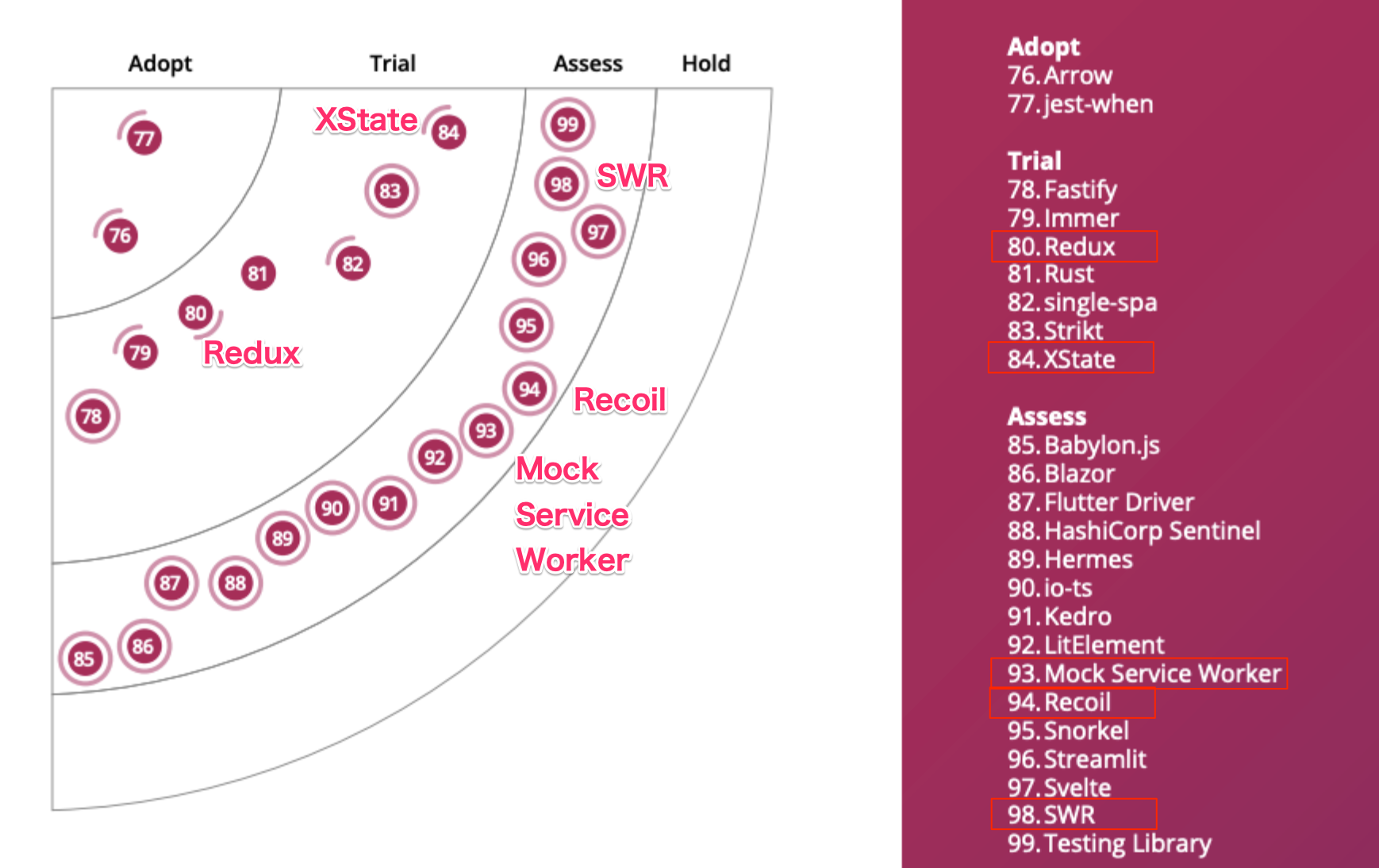 前回 Adopt だった Redux が Trial に変更された。